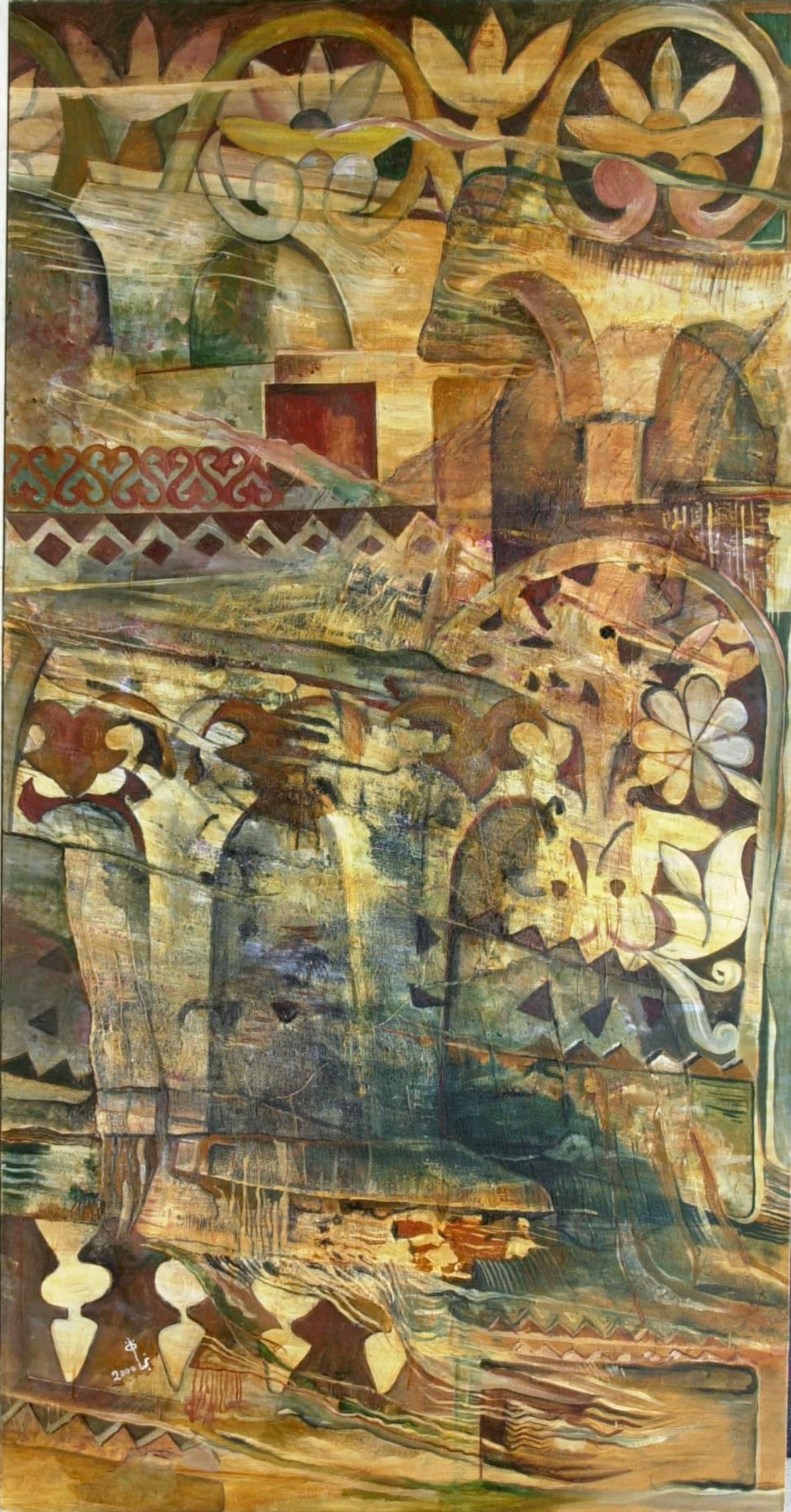 في هذا العمل برزت القيم الزخرفية لأنماط مختلفة من الزخرفة المشجرة الموجودة في العمارة التقليدية بما بها من جمالية في تشابك وانحناءات من الخطوط بين الغائر والبارز .