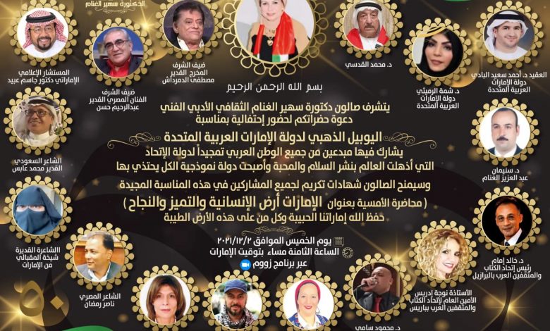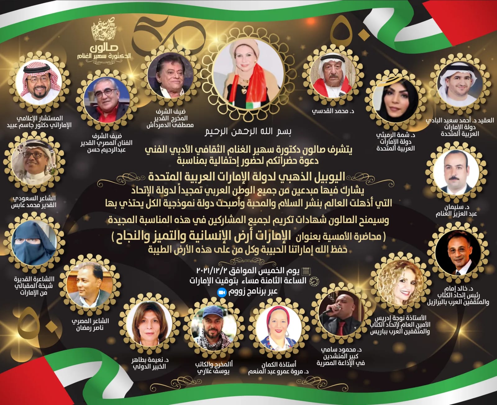 أقام صالون دكتورة سهير الغنام الثقافي الأدبي الفني في أمسيته الثامنة عشرة الخميس الموافق 2/12/2021 احتفالية بمناسبة اليوبيل الذهبي لاتحاد دولة الإمارات العربية المتحدة استمرت أكثر من ثلاث ساعات إجتمع فيها مبدعون من ألمع نجوم في الوطن العربي.