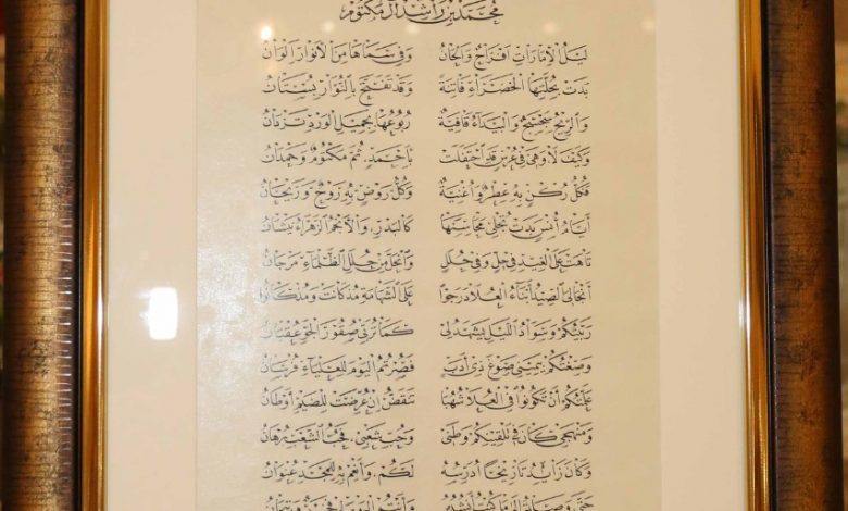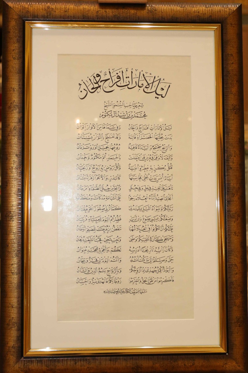 كما ضم المعرض لوحة لقصيدة” زايد بن سلطان أبو الجميع قيادة وشعباًا” للمرحوم سلطان بن علي العويس والتي قال فيها: