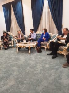 نوال حلاوة ود. غانم السامرائي يتوسطهما مصطفى الحفناوي و يمين الصورة محمد إدريس ويسارها الفنانة العراقية فوزية الشندي