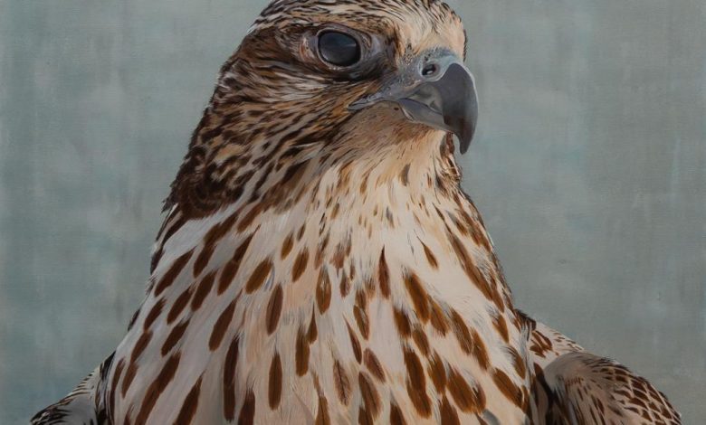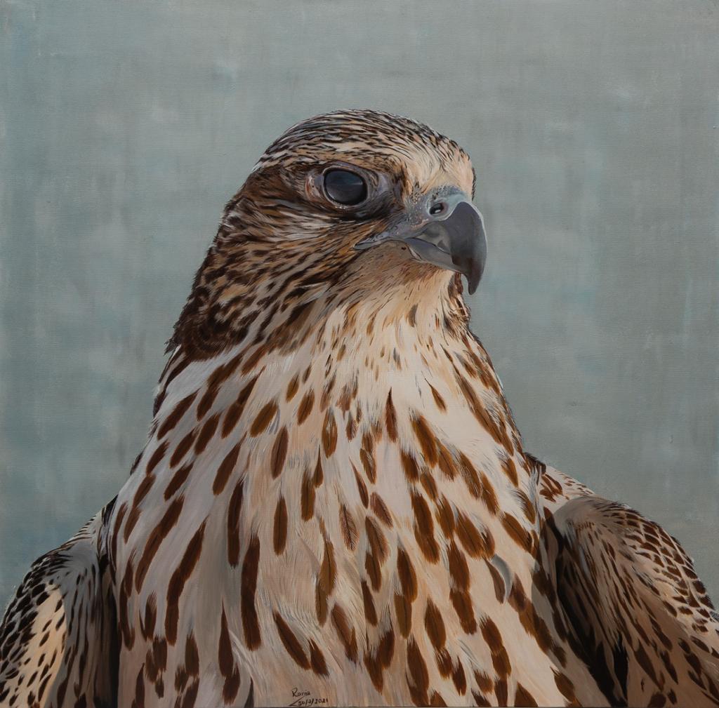 الصقر طير (شامخ الهيبة)وهذه اللوحة تمثل طير الشيخ حمدان بن راشد آل مكتوم رحمه الله ، وهي رمز لطير محبوب في البيئة الإماراتية يعنى بتربيته ومعايشته عشاق رياضة الصيد بالصقور، وكانت هذه الرياضة من أبرز هوايات المغفور له الشيخ حمدان بن راشد آل مكتوم رحمه الله، واللوحة مستوحاة من صورة بعدسة محمد حسين المصور الفوتغرافي الخاص لمغفور له بإذن الله