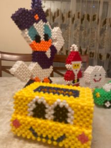 & أستخدم في عملي إبرة الخياطة المعروفة، ويعتمد عملي على مادة خرز كريستال مقاس 8 الذي يحتاج إلى تفاصيل كثيرة، ومقاس 10 الذي لا يحتاج إلى هذه التفاصيل.