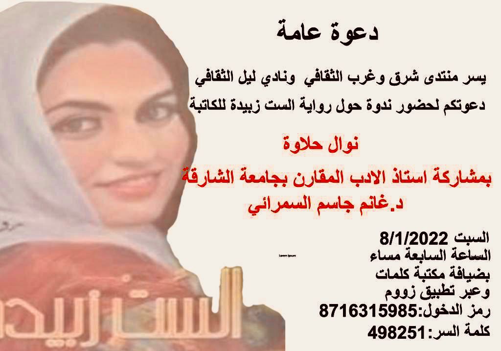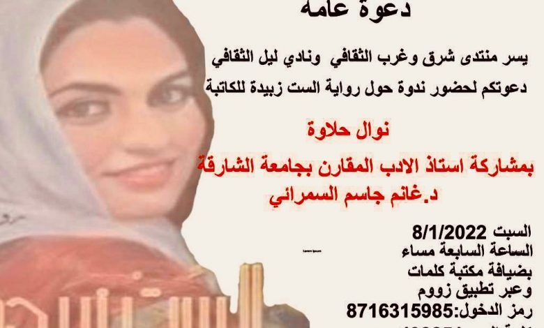ندوة حول رواية “الست زبيدة” للكاتبة نوال حلاوة  في مكتبة “كلمات” في دبي وعبر “زووم”