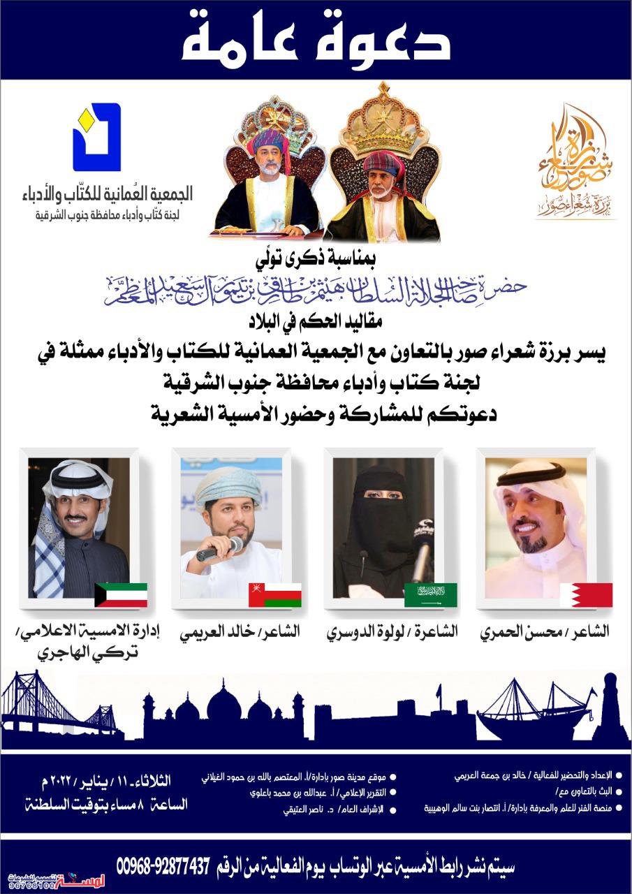 تنظم ” برزة شعراء صور” بالتعاون مع الجمعية العمانية للكتاب والأدباء، ممثلة في لجنة كتاب وأدباء محافظة جنوب الشرقية الثلاثاء 11 يناير 2022 الساعة 8 مساء أمسية شعرية بتوقيت الإمارات وسلطنة عمان بمشاركة الشعراء والشاعرات :