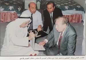 سلطان بن علي العويس مع نزار قباني وفي الصورة د. محمود علياء ونواف العمصي