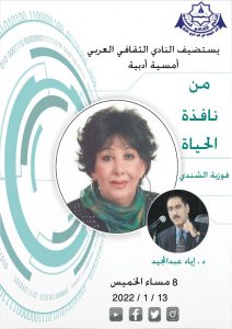 نظم النادي الثقافي العربي في الشارقة ضمن برنامجه الأسبوعي الخميس 13 يناير 2022 معرضًا فنيًا أعقبته أمسية أدبية حول كتاب “من نافذة الحياة” للكاتبة فوزية الشندي بحضورها ومشاركتها، وطرح د. إياد عبد المجيد دراسة جادة ومتأنية تتسم بالعمق والموضوعية حول الكتاب وقف فيها على ستة عشر من السيناريوهات التي طرحت صورًا متنوعة من الحياة. قدم للأمسية الشاعر نصر بدوان وحضرتها نخبة من المبدعين والمثقفين.