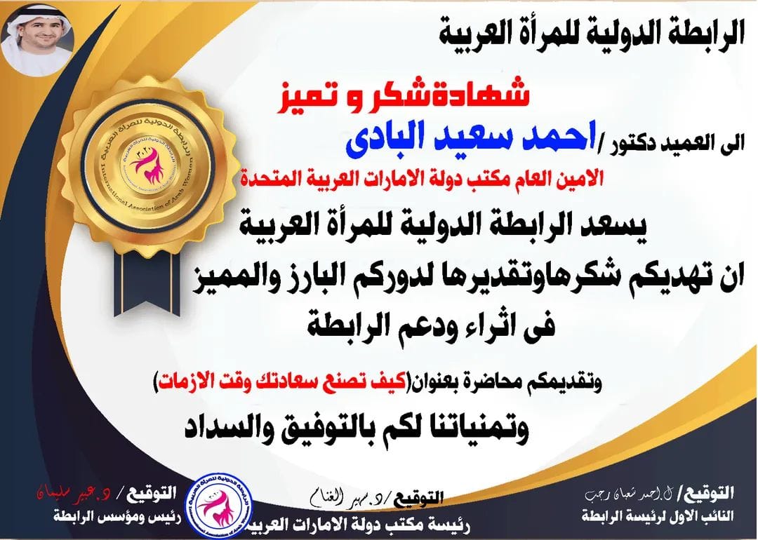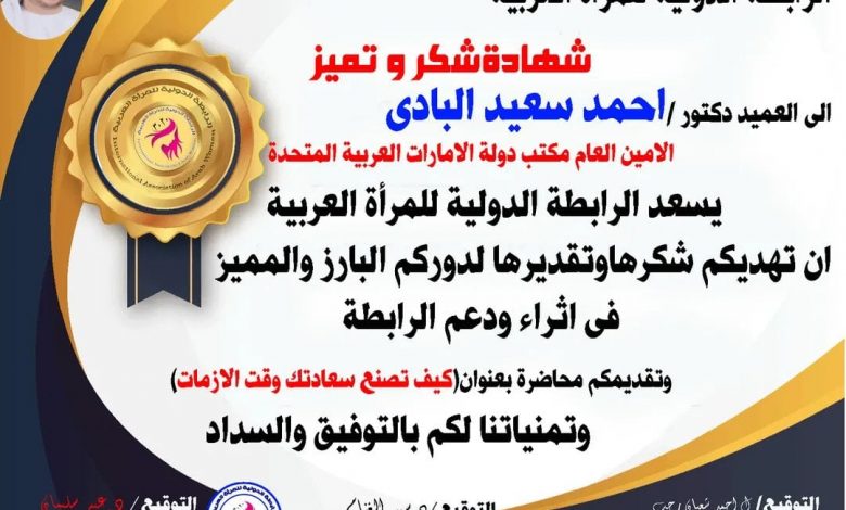 بعد ذلك قدمت سعادة الدكتور أحمد سعيد البادي من دولة الإمارات العربية المتحدة وهو خبير متمرس ومتمتع بخبرة عملية كبيرة جداً تطورت على مدار مايزيد غن عقدين من العمل في العديد من البيئات والمناصب الإداراية والإشرافية، حيثُ شرح بإستفاضة كيف يصنع الإنسان سعادته وسط الأزمات ،كما أنه عرض أن يتبنى حالات تحتاج للمساعدة ومتابعتهم بشكل دوري، وهذا كان هدية وتقديرًا للرابطة الدولية للمرأة في زيادة الوعي والمساندة، وهنا قدمت له سعادة الدكتورة سهير الغنام الشكر والتقدي،ر وفي نهاية المحاضرة منحته شهادة التميز والتكريم على مجهوداته لدعم الرابطة والرقي بها والعمل على زيادة الوعي المجتمعي.