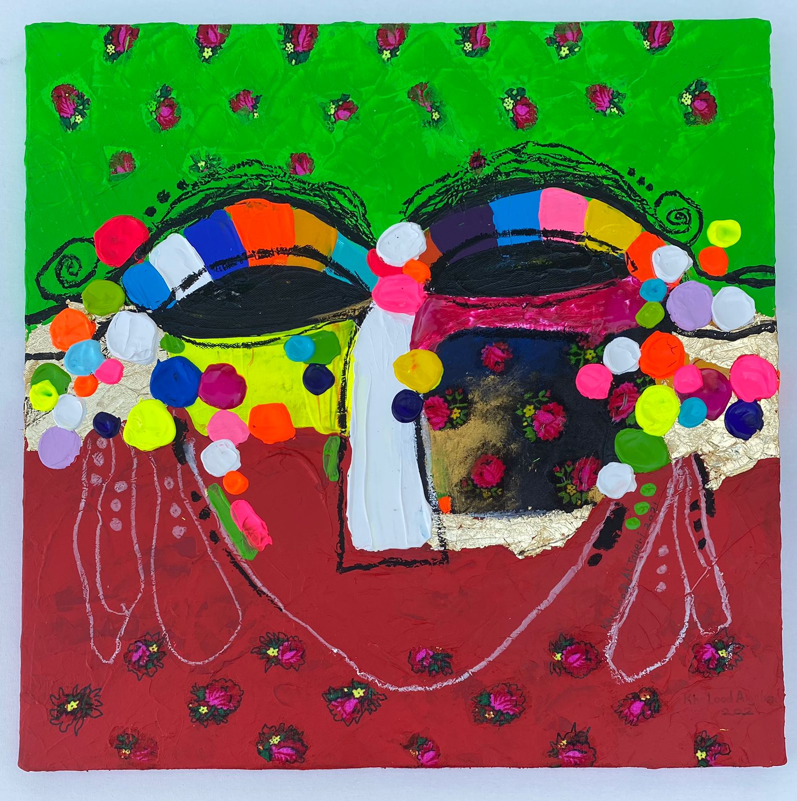 لوحة “وجوه مبرقعة” مرسومة بألوان الإكريلك باستخدام السكين وتقنيات أخرى في الوقت نفسه، وقد رسمت تعابير الوجوه عبر بقع من الألوان تتراوح بين هارموني تأسس باحتفالية لونية رمزها عيون قادمة من أفق اللوحة، تُخرج التكوين من محدودية المفهوم إلى انطلاق أكثر حرية وأوسع رحابة عبر فضاء مساحات لا تحددها التقنيات ، معلنة أن المرأة الإماراتية تتطور بخطوات تسابق فيها التطور ذاته.