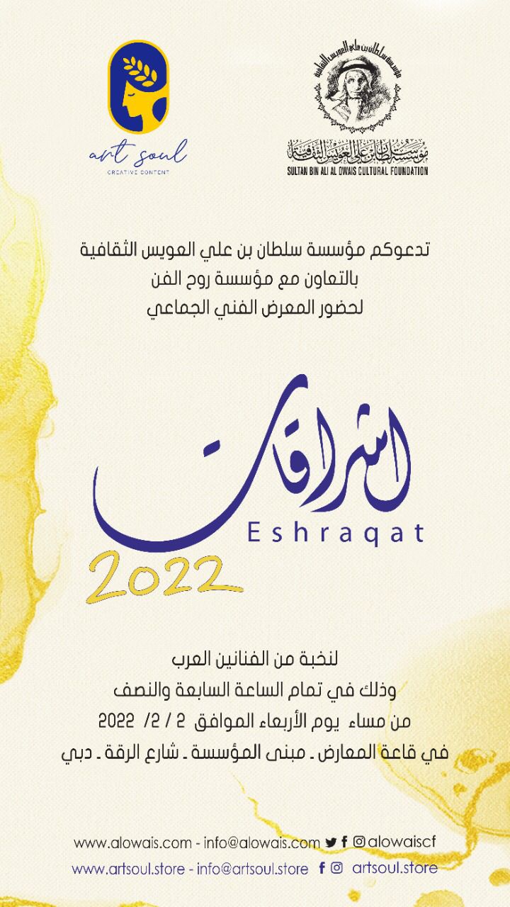 نظمت مؤسسة سلطان بن علي العويس الثقافية في دبي مساء الأربعاء 2 فبراير 2022 فعاليات المعرض الفني “إشراقات 2022” بالتعاون مع مؤسسة “روح الفن”، وشارك فيه 24 فناناً وفنانة من مدارس واتجاهات فنية متباينة.