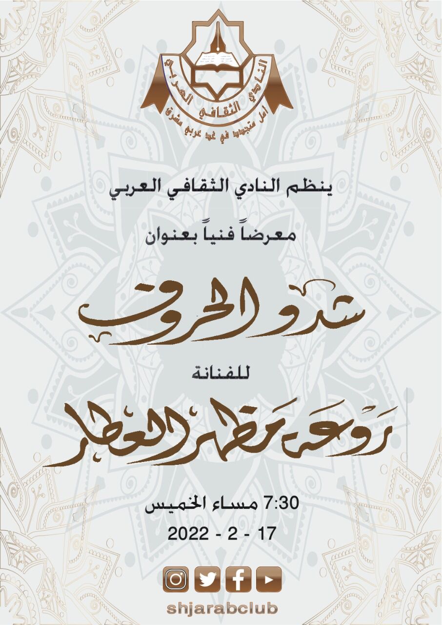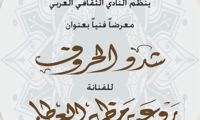 افتتح الدكتور عمر عبد العزيز رئيس مجلس ادارة النادي الثقافي العربي والفنان خليفة الشيمي مسؤول الفعاليات والمعارض في النادي الخميس 17 فبراير 2022 المعرض الفني “شدو الحروف” للفنانة روعة مظهر العطار. حضر الافتتاح جمع من محبي الفنون والمثقفين،وقدم الفنان خليفة الشيمي بهذه المناسبة للفنانة شهادة تقدير وهدية تذكارية تكريمًل لها.