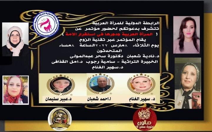 عقدت الرابطة الدولية للمرأة العربية بالتعاون مع صالون دكتورة سهير الغنام الثقافي الأدبي الفني واتحاد الكتاب والمثقفين العرب في الإمارات ومقره باريس، الثلاثاء الموافق الثامن من مارس 2022، مؤتمرًا احتفاليًا بمناسبة يوم المرأة العالمي ، وذلك بحضور كريم من مؤسسة الرابطة دكتورة عبير سليمان، والنائب الأول سعادة المستشار أحمد شعبان رجب. أدارت فعاليات المؤتمر سعادة الدكتورة سهير الغنام رئيسة مكتب الرابطة في دولة الإمارات العربية المتحدة ورئيس ومؤسس صالون دكتورة سهير الغنام الثقافي الأدبي الفني ورئيس مكتب اتحاد الكتاب والمثقفين العرب في الإمارات ومقره باريس، حيث افتتحت المؤتمر بكلمة ترحيبة قالت فيها : من أرض الإمارات أرض الإنسانية والتميز والنجاح أرض المحبة والسلام أحييكم أنا دكتورة سهير الغنام رئيس مكتب الرابطة الدولية للمرأة العربية بالإمارات ومؤسس ورئيس صالون دكتورة سهير الغنام الثقافي الأدبي الفني ومدير مكتب اتحاد الكتاب والمثقفين في الإمارات ومقره باريس.