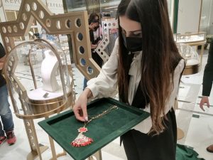 لقد تم تنفيذ التصميم بالكامل بمنتهى الدقة؛ بعد ذلك سيتم تجهيز كل من المرجان والملاكيت باعتبارها قلادات فريدة من نوعها. لقد كان اللمعان والتقاليد الإسلامية العنصران المستخدمان في استلهام الرؤية لمخطط الألوان، ابتداءً بالنقش المُعقد للقلادة المستوحاة من البلاط الأندلسي والزخارف الزهرية التي امتدت لتصل حتى إلى تصميم الخُطَّاف الذي يحمل حبات اللؤلؤ والمرجان، وعن طريق استغلال فكرة تنوع المجوهرات أحسن استغلال، يمكن إزالة شُرابة اللؤلؤ أو إضافتها بحيث يمكن صنع القلادة بتصميم معاصر ولمسة حسية تقليدية؛ فما من طريقة أفضل للاحتفال برمضان من هذه الهدايا الشخصية التي تم تغليفها تغليفًا يدويًا على يد الخطاط والمصمم الإماراتي المعروف “نرجس نور الدين”.