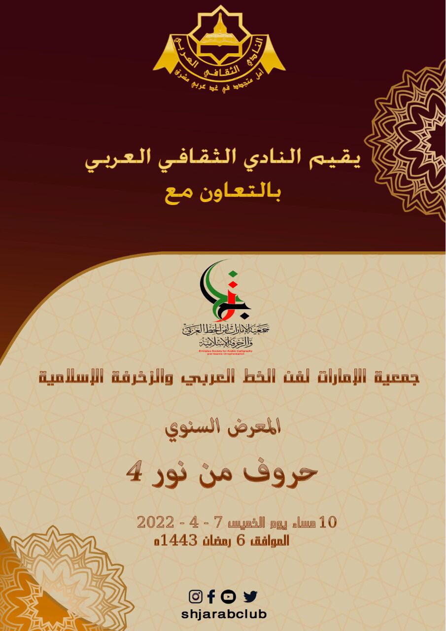 نظم النادي الثقافي العربي في الشارقة بالتعاون مع جمعية الإمارات للخط العربي والزخرفة الإسلامية الخميس 7 إبريل 2022 ، المعرض السنوي “حروف من نور” في دورته الرابعة.  افتتح المعرض د. عمر عبد العزيز رئيس مجلس إدارة النادي والأستاذ علي المغني نائب رئيس مجلس الإدارة  بحضور الفنان خليفة الشيمي مسؤول اللجنة الفنية في النادي، وضي النعيمي المنسق العام للمعرض والمدير النتنفيذي لجمعية الإمارات للخط العربي والزخرفة الإسلامية و آمنة الملاك وعدد من الفنانين والمثقفين والمهتمين.