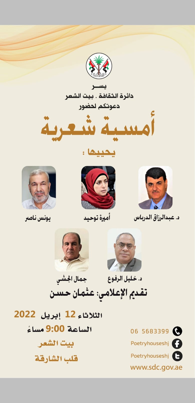 أحيا الشعراء د. عبد الرزاق الدرباس وأميرة توحيد و يونس ناصر و د. خليل الرفوع و جمال الجشي الثلاثاء 12 إبريل 2022 أمسية نظمها بيت الشعر في الشارقة بحضور مديره الشاعر محمد عبد الله البريكي . قدم للأمسية الإعلامي عثمان حسن ، و كرّم الشاعر البريكي في ختامها الشعراء المشاركين، وتم التقاط صورة تذكارية معهم.