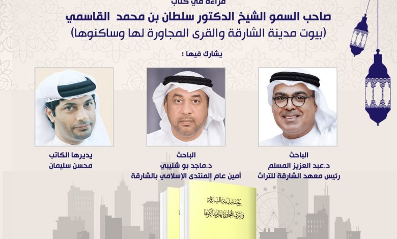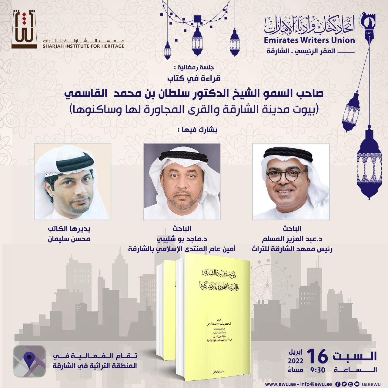 نظم اتحاد كتاب وأدباء الإمارات ومعهد الشارقة للتراث السبت 16 إبريل 2022 جلسة رمضانية خصصت لقراءة في كتاب صاحب السمو الشيخ الدكتور سلطان بن محمد القاسمي “بيوت مدينة الشارقة والقرى المجاورة لها وساكنوها”. تحدث في الجلسة د. ماجد بوشليبي ود. عادل الكسادي، وقدم لها الأديب محسن سليمان، وقد اعتذر د. عبد العزيز المسلم رئيس معهد الشارقة للتراث عن عدم المشاركة بسبب سفره.