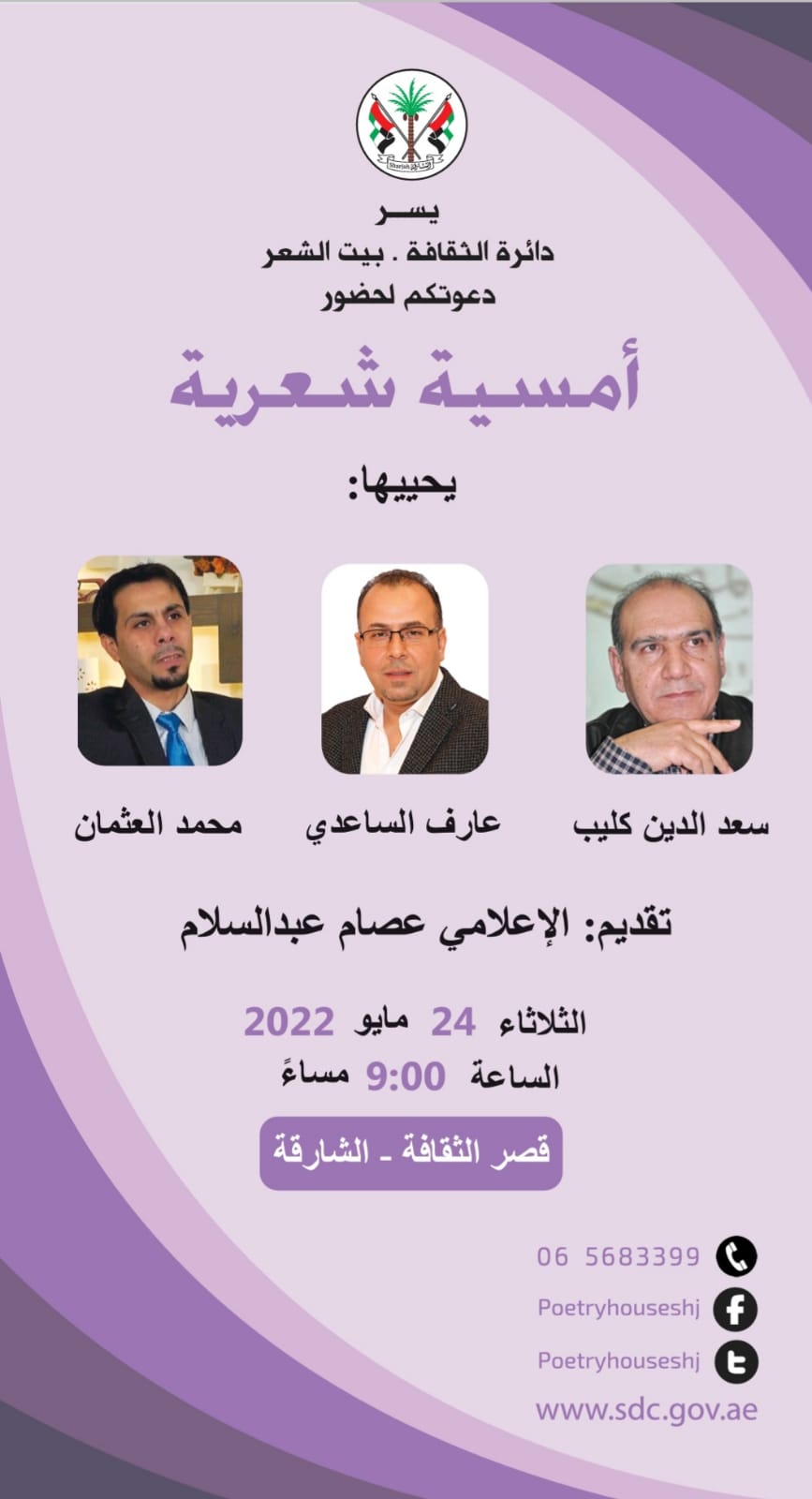 نظم بيت الشعر في الشارقة، يوم الثلاثاء ٢٤ مايو ٢٠٢٢ في قصر الثقافة أمسية شعرية احتفت بثلاثة وجوه شعرية ذات حضور متميز في المشهد الشعري العربي، وهم د. سعد الدين كليب من سوريا، د. عارف الساعدي من العراق، و أ. محمد طه العثمان من سوريا.