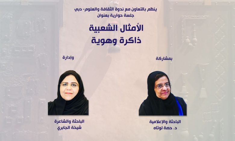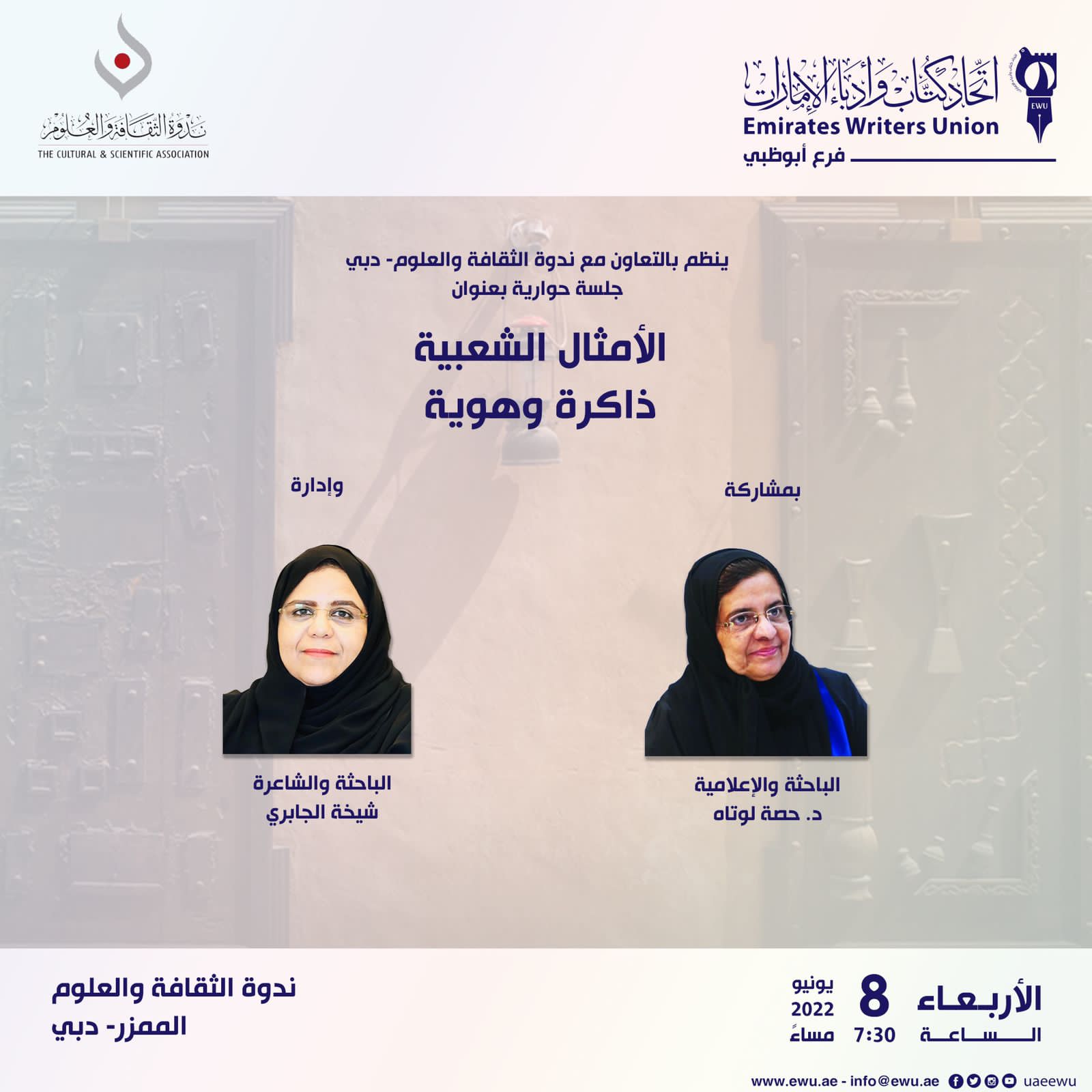 د. حصة لوتاه و شيخة الجابري نظم اتحاد كتاب وأدباء الإمارات بالتعاون مع ندوة الثقافة والعلوم في مقرها بدبي الأبعاء 8 يونيو 2022 جلسة حوارية بعنوان "الأمثال الشعبية ذاكرة وهوية" قدمتها الدكتورة حصة لوتاه وأداراتها الشاعرة شيخة الجابري، ودارت حول أهمية الأمثال الشعبية في حياة الشعوب ودلالاتها، وأعقب الحديث حوار ثري بين الحضور والمتحدثتين الرئيسيتين. حضر الجلسة الحوارية سعادة بلال البدور رئيس مجلس إدارة ندوة الثقافة والفنون وعدد من أعضاء مجلس الإدارة وجمع من الأدباء و المثقفين والإعلاميين.