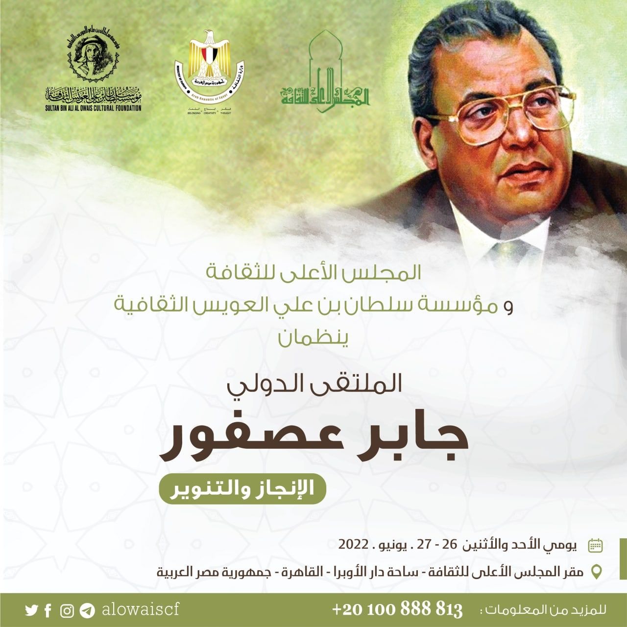 تنظم مؤسسة سلطان بن علي العويس الثقافية بالتعاون المجلس الأعلى للثقافة في مصر الملتقى الدولي “جابر عصفور.. الإنجاز والتنوير” في مقر المجلس الأعلى للثقافة في القاهرة بمشاركة نخبة من نقاد ومفكرين ومبدعين من أربع عشرة دولة عربية، وذلك في إطار حرص المؤسستين على الاحتفاء بالرموز الفكرية والثقافية، التي أثرت في الحركة الثقافية في الوطن العربي ومن بينهم الناقد الراحل الدكتور جابر عصفور لعرض جزء من إسهاماته في الحقل الثقافي وطرح رؤى لكيفية الاستفادة من منجزه الفكري.