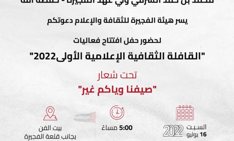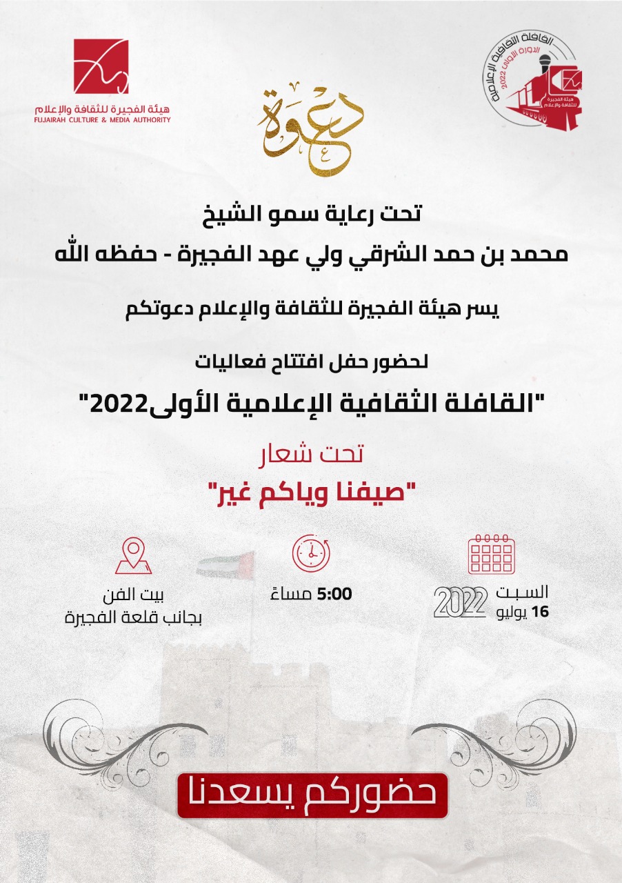 انطلقت السبت 16 يوليو 2022 فعاليات القافلة الثقافية الإعلامية، التي تنظمها هيئة الفجيرة للثقافة والإعلام برعاية سمو الشيخ محمد بن حمد الشرقي ولي عهد الفجيرة، تحت شعار “صيفنا وياكم غير”، وذلك في “بيت الفن” بجانب قلعة الفجيرة.