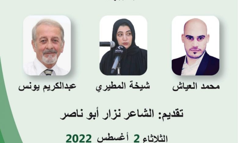 أحيا الشعراء محمد العياش وعبد الكريم يونس وشيخة المطيري الثلاثاء 2 أغسطس 2022 أمسية شعرية ضمن منتدى الثلاثاء في بيت الشعر في الشارقة بحضور الشاعر محمد عبد الله البريكي مدير بيت الشعر في الشارقة ، الذي كرّم في ختام الأمسية الشعراء ومقدمهم الشاعر نزار أبو ناصر.