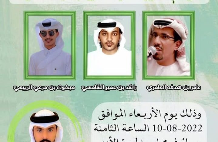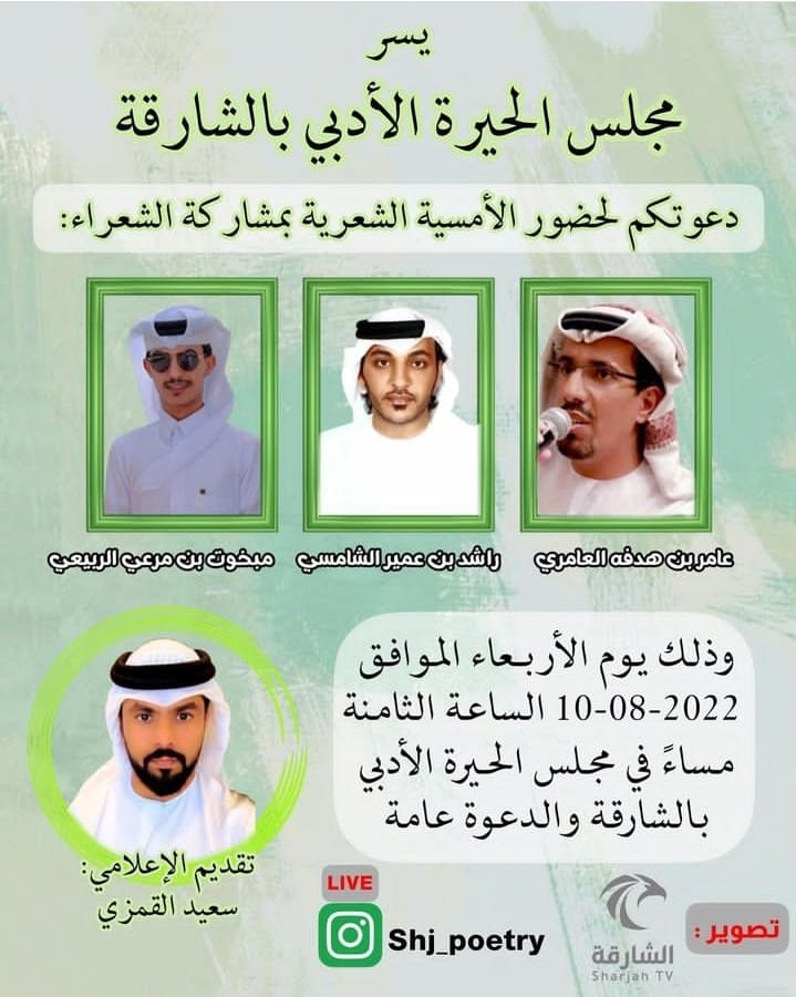 من اليمين مبخوت بن مرعي الربيعي و راشد بن عمير الشامسي و عامر بن هدفة العامري وسعيد القمزي بطي المظلوم يتوسط الشعراء ومقدمهم المكرمين نظم مجلس الحيرة الأدبي في الشارقة الأربعاء 10 أغسطس 2022 أمسية من الشعر الشعبي ضمن أمسياته المتميزة بحضور سعادة الشاعر بطي المظلوم مدير مجلس الحيرة الأدبي أحياها الشعراء عامر بنهدفة العامري وراشد بن عمير الشامسي و مبخوت بن مرعي الربيعي. قدم للأمسية الإعلامي سعيد القمزي الذي أدارها بمهارة وأجرى حوارًا مع الشعراء المشاركين حول مفهوم الشعر ورسالة الشاعر أسلوبه، وفي ختام الأمسية التي لاقت استحسانًا من الحضور وجه الشاعر بطي المظلوم كلمة حيا فيها الشعراء المشاركين ، وأشاد بدعم صاحب السمو الشيخ الدكتور سلطان بن محمد القاسمي ، ودور الشاعر ورسالته، وتلا ذلك تكريم الشاعر بطي المظلوم للشعراء المشاركين ومقدمهم. ومما أنشده الشاعر عامر بنهدفه العامري قصيدته "القدوة المأمونة" أهداها إلى مقام صاحب السمو الشيخ الدكتور سلطان بن محمد القاسمي عضو المجلس الأعلى للاتحاد حاكم الشارقة ،حفظه الله، يقول فيها: الـصـدق عندي و الـشِـعـر تـلـقـونـه أسـاسـه الـحُـبّ الـنـقـيّ مـضـمونـه يـا مـن حـضر في مـجلسٍ ما سِـكّر بــابـه مــشــرّع لـلـعــرب يــلـفـونـه ســلام مـن بــعــد الـسـلام تــحـيّــه لـلّـي فــعـولـه بـالــشـرف مــقـرونـه وفي قصيدته " آية الوجد" بقول: يا آية الوجد يا سحر الهوى و الغرام كل ما يهلّ الدّجى و النوم جيتي سعي ما لك و مال العيون المسهدة والمنام ما دام لك مُهجتي والقلب فيه أرتعي من بعد عِرف الحقوق و قبل فصل الكلام آثرت درب السلامه قبل درب النعي قدّمت لك غصنْ زيتون وْ حمامة سلام من خوف بُعدك عذاب وْ جنّتك مطمعي "مثايل بيّنه" من قصائد الشاعر عامر وفيها: يقول بن هدفه مثايل بيّنه عليها التجارب معطيات ضمان ما قالها إلا من مشاعر صادقه عسى من سمعها يستفيد بيان الله خلق والله فرق في أمته بالفكر والأفعال والأبدان كلٍّ على ما قيل يتبع نظرته م اختصّها المبصر على العميان ما ينفعك طيب الحصان وقوّته إن ما ركب فوق الحصن حصان ويختم القصيدة بقوله: لا تحتقر في النّاس واعلم أنّه أعظم وصايا جات من لقمان والله لو تطول فلا انته بالغ جبال الهدى والاّ جبال عمان وأنشد الشاعر راشد بن عمير الشامسي عددًا من قصائده يقول في إحداها: أذوق من ذا الهجر مِرّه و القلب .. يترزّم .. بزفرات كل ما فَخَتْ .. بالصوت يَرّه ذاك الحنين و مول مابات مثلي .. يلي تصليه .. حَرّه من زود ما في الصدر ضيقات يكفيك .. يالمضنون .. شَرّه كانك خِلِيّ البال .. و اتبات ومن قصائده : بشّر المشتاق .. عن حالك يا عسى باقي .. على حِلّه ودّي اتخبّرك .. واسالِك عن زمانك لي .. مضى كِلّه يوم ادوّر رقم .. جوالك و اتّصل ..دايم ولا اتشِلّه ما خطر ذِكري على بالك كيف قلبك ما ذِكر .. خِلّه كيف هذا الحال يهنالك تحّرق .. الخَفّاق .. و تمِلّه! ومما أنشد الشاعر راشد الشامسي: مرحبا .. باللي نشد عَنّا به ... نهليبه ... ملايينا طارشه من سار و تعنا لين .. يوصلنا .. ويلفينا مرحبا .. و العين .. تتمنّا شوف من طرّش وياتينا له بشاشت خاطرن منا يوم .. يلفينا .. و يعنينا يشتفي صبّن به امعَنّا عقب ذاك الحال يحيينا يعل داره مرعدن دنا وين ما يسكن شمالينا حايبن يسكب ولا .. ونّا يسقي ادياره و يسقينا و افرح بشوفه و نتهنا بالعمر .. و يّاه ... سالينا وأنشد الشاعر مبخوت بن مرعي مجموعة من قصائده يقول في إحداها: : اليله اليله علا القاف ترتيل غنت به الشعار يصدح صداها اخيل لي برقن ولاحدن به ايخيل إثر البروق اتلوح بعلى سماها من دون لاقند ولا بهر ابهيل جات القوافي عالين مستواها مسرا علا المطلع ولا بدل وشيل ماكنها الاجات وهبه عطاها وسريبها من دون دق وتفاصيل يم الكريم ولاتنصت لقاها للخير مبدا والصعايب تساهيل شجرة عطا دايم طويلن مداها ياسيدي سلطان يا مدرس الجيل اثريت لشعوبك مبادي مشاها مبدا شرف للخير مافيه تبديل ومحبتك فـ لقلب يعمّر بناها يدك عطاهم في جميع المحاصيل وارواحهم لجلك