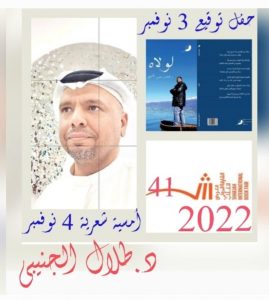 يحتفل الشاعر د. طلال الجنيبي بتوقيع ديوانه الشعري الحادي عشر “لولاه” يوم الخميس الموافق 3 نوفمبر 2022 في ركن التواقيع الساعة 8 مساء ضمن فعاليات معرض الشارقة الدولي للكتاب.