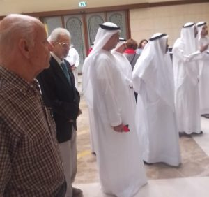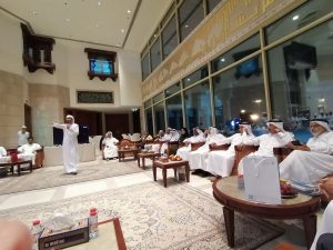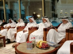 محمد المر وإلى يمينه بلال البدور وإلى يمينه د. حنان بن عبدالله ومن اليمين د. شهاب غانم وعلي عبيد الهاملي و د. صلاح القاسمراشد حسن السعدي يشرح تنظيم المعرض