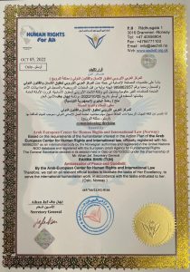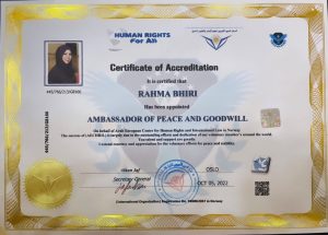 تهنئة إلى رحمة البحيري سفيرة السّلام والنّوايا الحسنة من المركز العربي الأوروبي للقانون الدولي وحقوق الإنسان (مملكة النّرويج)
