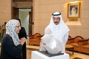 وشارك الفنان محرز اللوز بمنحوتتين من الرخام الأولى بعنوان “شاهقة” وتتسم بالانسيابية والإبهار والثانية “لقا” و تمثل المنحوتتان كتلتين متقابلتين تكادان أن تلتصقا رغم المسافة.