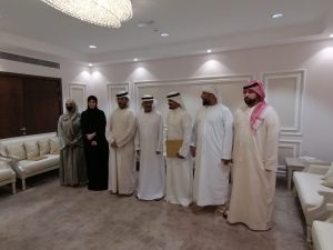 بطي المظلوم ود.عبدالله بالحيف النعيمي يتوسطان المشاركين بعد تكريمهم من اليمين عمار بن إدريس و عادل الجهوري و محمد العنزي و نورة الشامسي ونشيرة الجابري