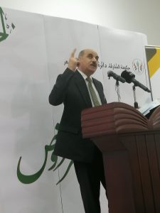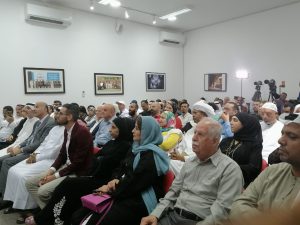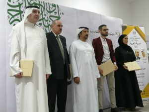 محمد عبدالله البريكي يتوسط المشاركبن بعد تكريمهم من اليمين مريم رضوان و شمس الدين بوكلوه و د. أكرم جميل قنبس و محمد العمادي
