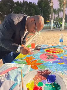 و بمشروعه بدا الفن لغة التسامح من خلال لوحة “المحبة والسلام” في العام ٢٠٠٥ م ، وبلغ طول اللوحة ١٧٥٠ مترًا ، وشارك في رسمها قرابة ١٣ألف إنسان من مختلف أجناس البشر، وهو يتوقف في كل محطة ليتحدث بحب عن الإنسان ، ويستحضر كل وقفة في رسائله عبر منصات التواصل الاجتماعي مشاركًا شعوب العالم في نشر ثقافة التسامح بألوان السلام.