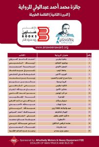 أما أسماء المرشحين للفوز بجائزة محمد أحمد عبد الولي للرواية (الدورة الثانية) فأتت وفقا للقائمة الطويلة: