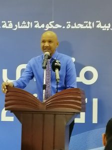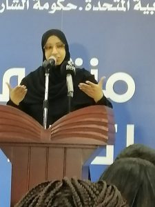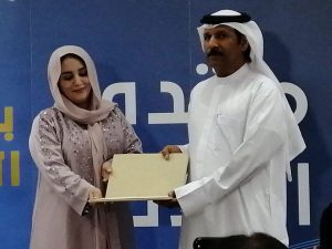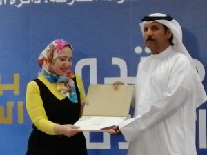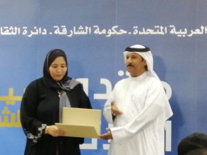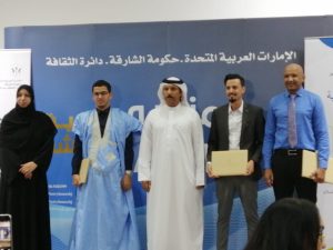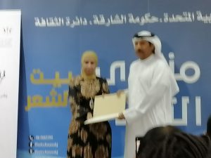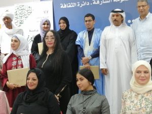 محمد عبدالله البريكي يتوسط الشعراء المشاركين و مقدمهم بعد تكريمهم من اليمين عصام عبدالسلام ومحمد بوثران و سيبدي محمد المهدي و نجاة الظاهري