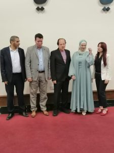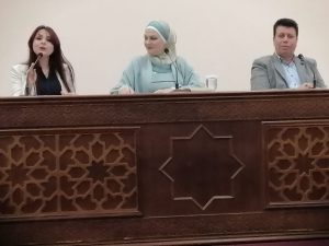 محمد ولد سالم ومحمد إدريس في لقطة تذكارية مع الشاعرين ومقدمتهما بعد التكريمفاتح البيوش ومارية طرموش ووراد خضرجانب من الحضورصورة تذكارية تجمع عددًا من الحضور