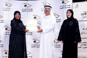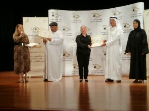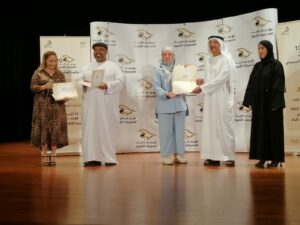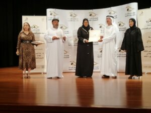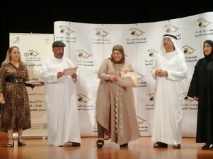 أحمد بورحيمة يتوسط المكرمينأحمد بورحيمة يكرم أماني فاروق وفي الصورة إبراهيم سالم وإلى يمينه خليدة الشيبانيتكريم أمل النعيمي.. وتكريم جاسم التميمي.. ونتكريم د. رندة عبيد.. وتكريم هدى بشر