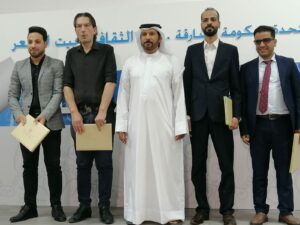 محمد عبدالله البريكي يتوسط الشعراء ومقدمهم بعد تكريمهم من اليمين : د. مهدي الشموط و ميشيل العيد و مهند الشريف ومحمد فكري