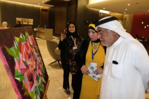 د. محمد يوسف يفتتح المعرضد. محمد يوسف يطالع لوحة وإلى يمينه سهام الوزيري