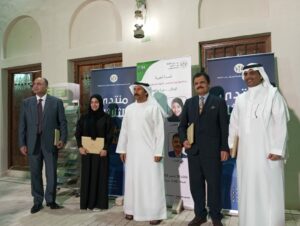 محمد عبدالله البريكي يتوسط الشعراء ومقدمهم بعد تكريمهم من اليمين سليمان المطيري وعلي الإمارة وشيخة المطيري و علي عمران