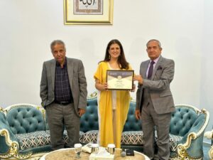 د. عمر عبدالعزيز يفتتح المعرض يرافقه د. خليفة الشيميريم قبطان خلال تكريمها