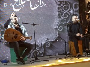 وتوالت فقرات الحفل، فاعتلت المسرح المطربة دانة صلاح التي غنت مجموعة أغنيات اتسمت بأجواء فلسطينية تفاعل معها الحضور، وتلتها فقرة موسيقية ودبكة فرقة “دلعونا”، وشاركت في الحفل طفلة فلسطينية من رفح  عمرها 8 سنوات غنت لفلسطين بالإنجليزية والفرنسية إضافة إلى العربية وسط تشجيع وإعجاب الحضور.