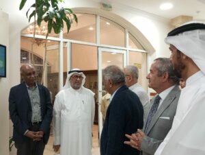 خالد الجلاف ود. عمر عبدالعزيز و إبراهيم سعيد بطي و د. خليفة الشيمي في جناح تاج السر حسن خلال الافتتاح