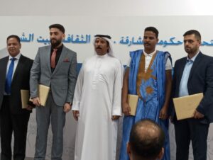 محمد عبد الله البريكي يتوسط الشعراء ومقدمهم بعد تكريمهم من اليمين رغيد جطل و البو ولد محفوظ و مصطفى الحاجي و رعد أمان