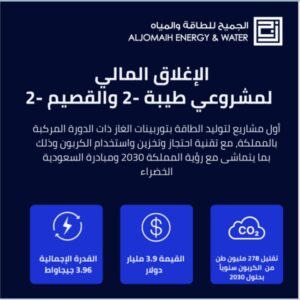 تم تحقيق الإغلاق المالي لمشروعي طيبة-2 والقصيم-2 لإنتاج الطاقة الكهربائية بتوربينات الغاز ذات الدورة المركبة (CCGT) بسعة إجمالية تبلغ 3.96 جيجاواط، في المملكة العربية السعودية.