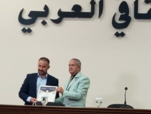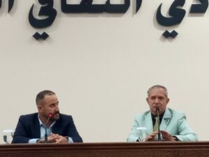 عقب الافتتاح اجتمع الحضور ومنهم عدد من الفنانين التشكيليين والمثقفين في ندوة احتضنتها قاعة الاحتفالات في النادي، حيث عرّف الفنان خليفة الشيمي بالفنان ربيع قرعوني، الذي تحدث بدوره عن تجربته الفنية مسلطًا الضوء على أفكاره وأسلوبه في العمل الفني ، ودار حوار حول أعمال الفنان أثرى الندوة وانعكس عبره إعجاب الحضور بالمعرض ومنحوتات الفنان، وفي الختام كرّم الفنان خليفة الشيمي الفنان ربيع قرعوني والتقطا مع الحضور صورة تذكارية.