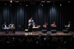 المحاضر مصعب الصاوي ناقد درامي متخصِّص ومنتج برامجي في مجالات الاتِّصال المرئي والمسموع، ومعد ومقدم برنامج “أغاني وأغاني” في قناة النيل الأزرق) تنقل بين نُوتات الموسيقى والغناء في السودان، جذورها ومصادرها والمؤثِّرات التي عمَلت على تشكيلها نغماً وإيقاعاً، راصداً قوساً واسعاً من التنوع التراثي. كما اشتملت المحاضرة على جملة من أشكال التعبير الغنائي التي تزاوج بين الفولكلور والموسيقى الحضرية، حيث عرِفت الحياة الفنيَّة الموسيقية في السودان التوثيق عبر الأسطوانات منذ عشرينات القرن الماضي وحتى تأسيس الإذاعة الوطنيَّة في العام 1940 م. وما أعقبها من نهضة وتحديث