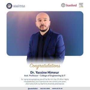 أحرز د. ياسين حيمر الأستاذ المساعد في كلية الهندسة وتقنية المعلومات في جامعة دبي مكانة مرموقة ضمن تصنيف جامعة “ستانفورد” لأعلى 2% من علماء العالم لسنتين متتاليتين 2023 و2024 والتي تشمل أفضل 2% من العلماء الأكثر تميزا في أعمالهم البحثية من حيث الجودة وإمكانية تطبيقها في مجالات مختلفة على مستوى العالم.
