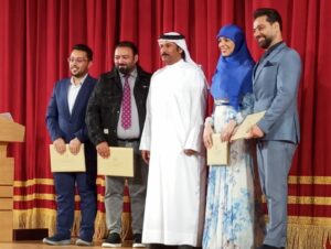 محمد عبدالله البريكي يتوسط الشعراء ومقدمهم بعد تكريمهم من اليمين حسام شديفات و سارة الزين و خالد الحسن و أحمد شبيب