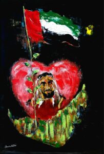لوحة تجسد حب الفنان الذي يقيم في دولة الإمارات منذ 43 سنة، وكيف وصلت إلى قلوب البشر بفضل حكمة الشيخ زايد بن سلطان آل نهيان رحمه الله وقيادته الحكيمة وحكمة حكامها وشيوخها، الذين رسموا خارطتها بماء من ذهب، والذين أوصلوها إلى الصدارة في مصاف دول العالم.