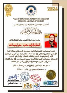* سفيرة السلام الدولي بعد الحصول على دورة تدريبية (عضوية أكاديمية سفراء السلام الدولية والمنظمة الدولية للاعتماد الدولي iAo التابعة لهيئة الأمم المتحدة)